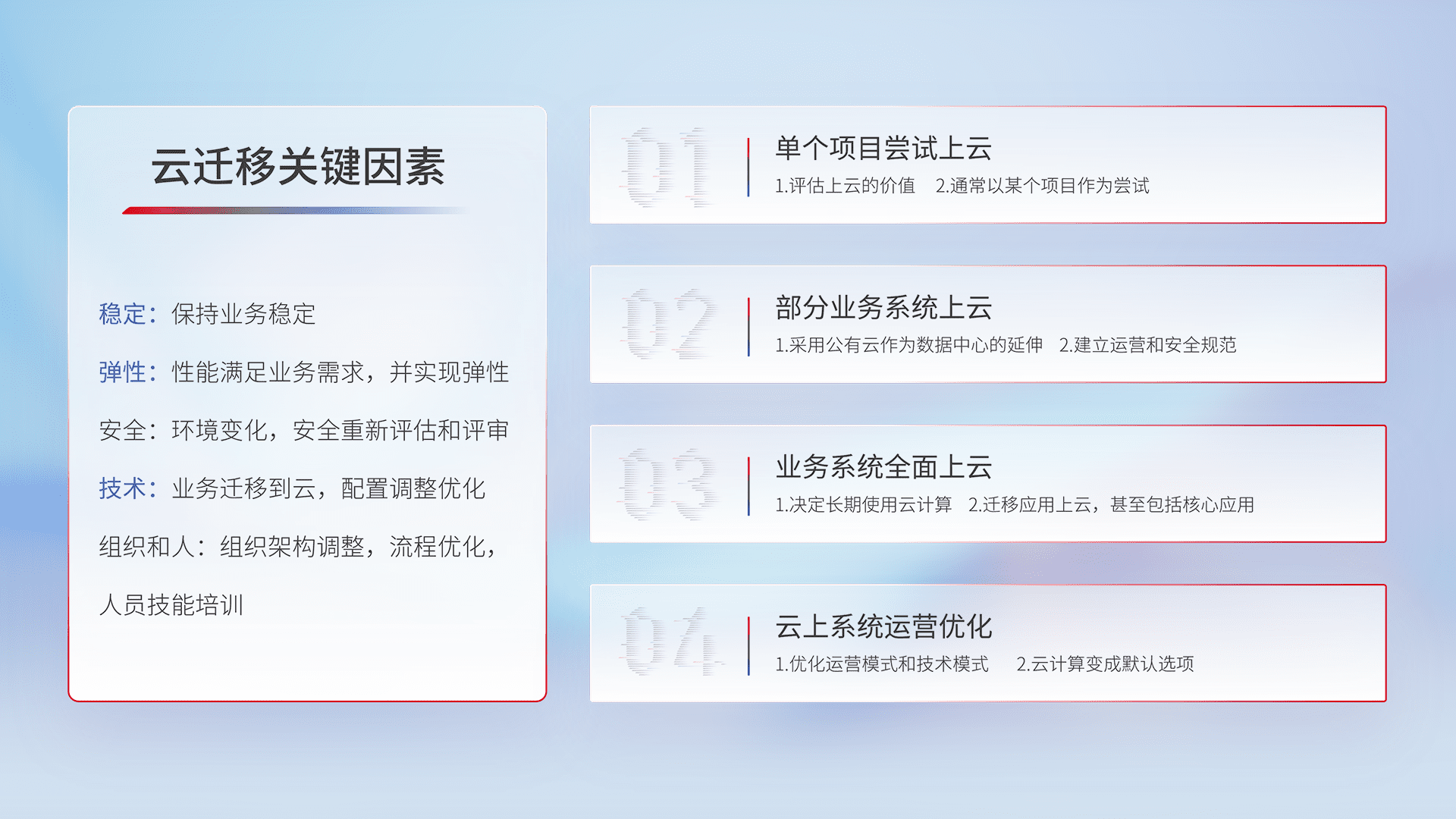 结合实际业务,,,从规划设计、、、、云平台选型、、、云原生改造、、、、数据迁移、、集成交付,,,迁移全过程为客户识别最佳上云路径,,,,做好风险识别管理,,设计网络架构、、、、身份权限、、、、安全审计合规、、操作审计、、日志审计、、、监控告警策略、、多站点容灾设计等,,,对云上基础设施进行整体规划,,提升IT治理水平,,以满足弹性、、高可用、、、高性能的需求。。。。