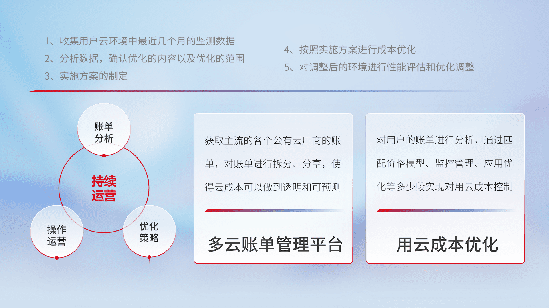 通过多云纳管,,,以统一的资源数据模型把客户的云资源进行抽象和封装,,进而实现对多云资源的统一操作,,保障云资源管理的可靠性、、、、稳定性与可用性。。。量身定制化运维内容,,,配置、、开发运维、、、补丁管理、、、、备份、、、、监控、、认证和访问管理、、、、审计和日常巡检等,,保障在用云过程中的可靠度,,稳定度以及高可用率。。。。